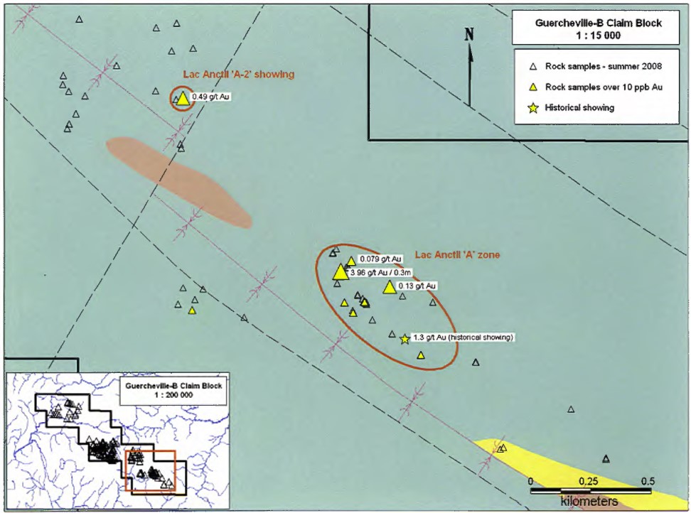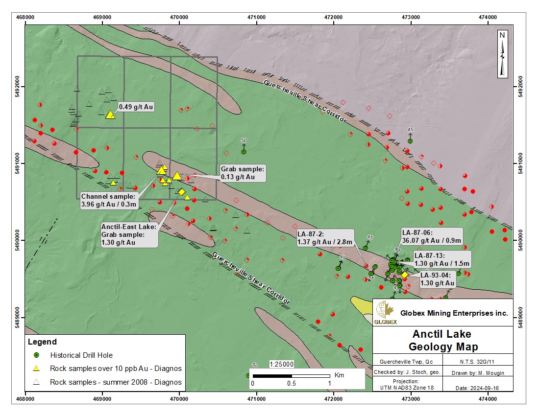 In 2008, Diagnos carried-out geological mapping and grab sampling (GM 64963) as well as IP and InfiniTEM geophysical surveys (GM 64964). These works highlighted new Au and Cu showings as well as several strong conductors on the Anctil Lake property. A channel sample returned 3.96 g/t Au over 0.3m about 400 metres NW of the Lac Anctil showing. A grab sample returned 0.49 g/t Au about 1.3 km NW of the Lac Anctil-Ouest showing, which Diagnos defined as a new Lac Anctil A-2 showing.