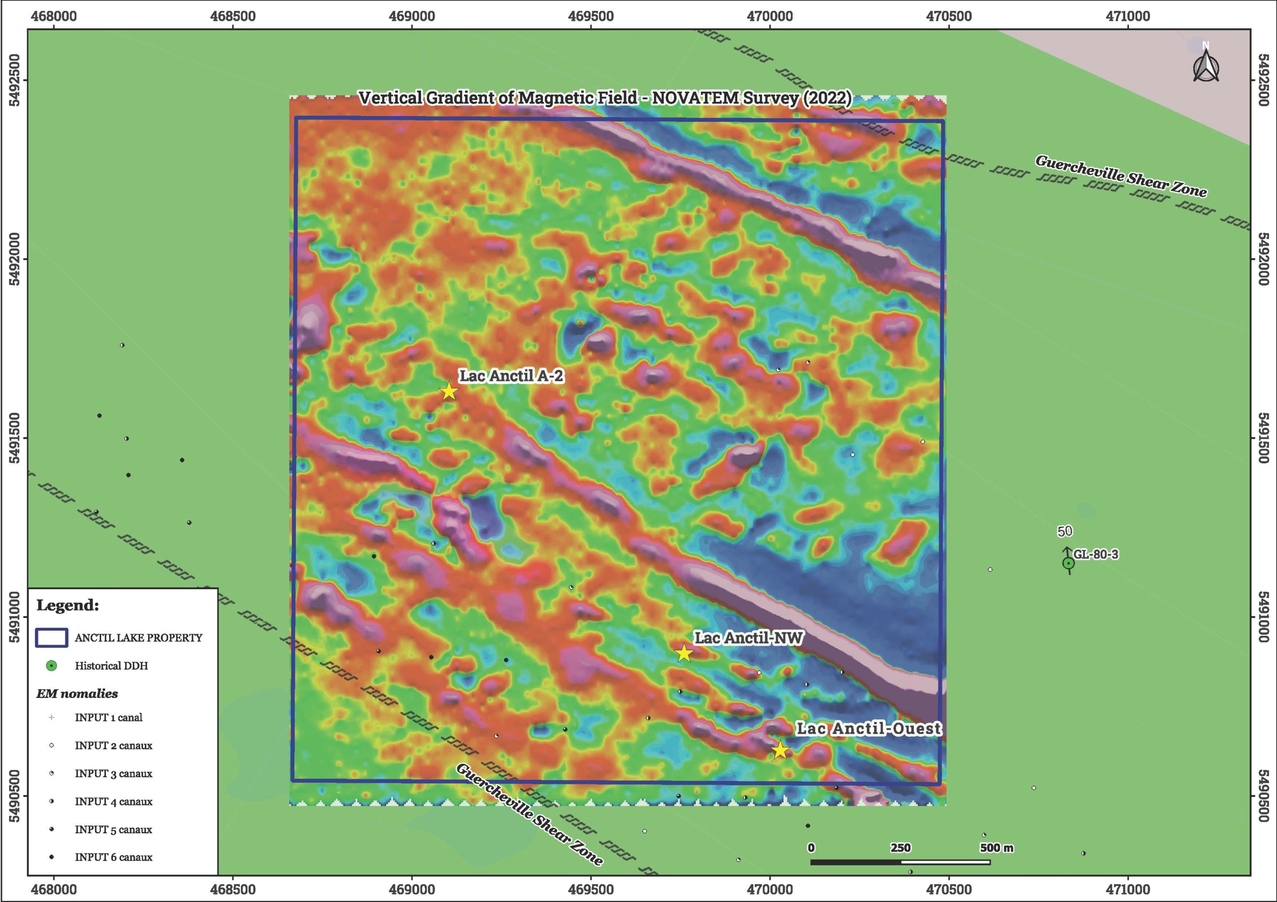 The Guercheville corridor represents the first-class metallotect for both Au and base metals mineralization in the area of the property. This regional structure hosts several showings and deposits, the most important one being the former Joe Mann mine located some 70 kilometres ESE of the Anctil Lake property, with a historical production of 4,289,221 tonnes of ore at 7.56 g/t Au and 0.23% Cu (GM 70966).