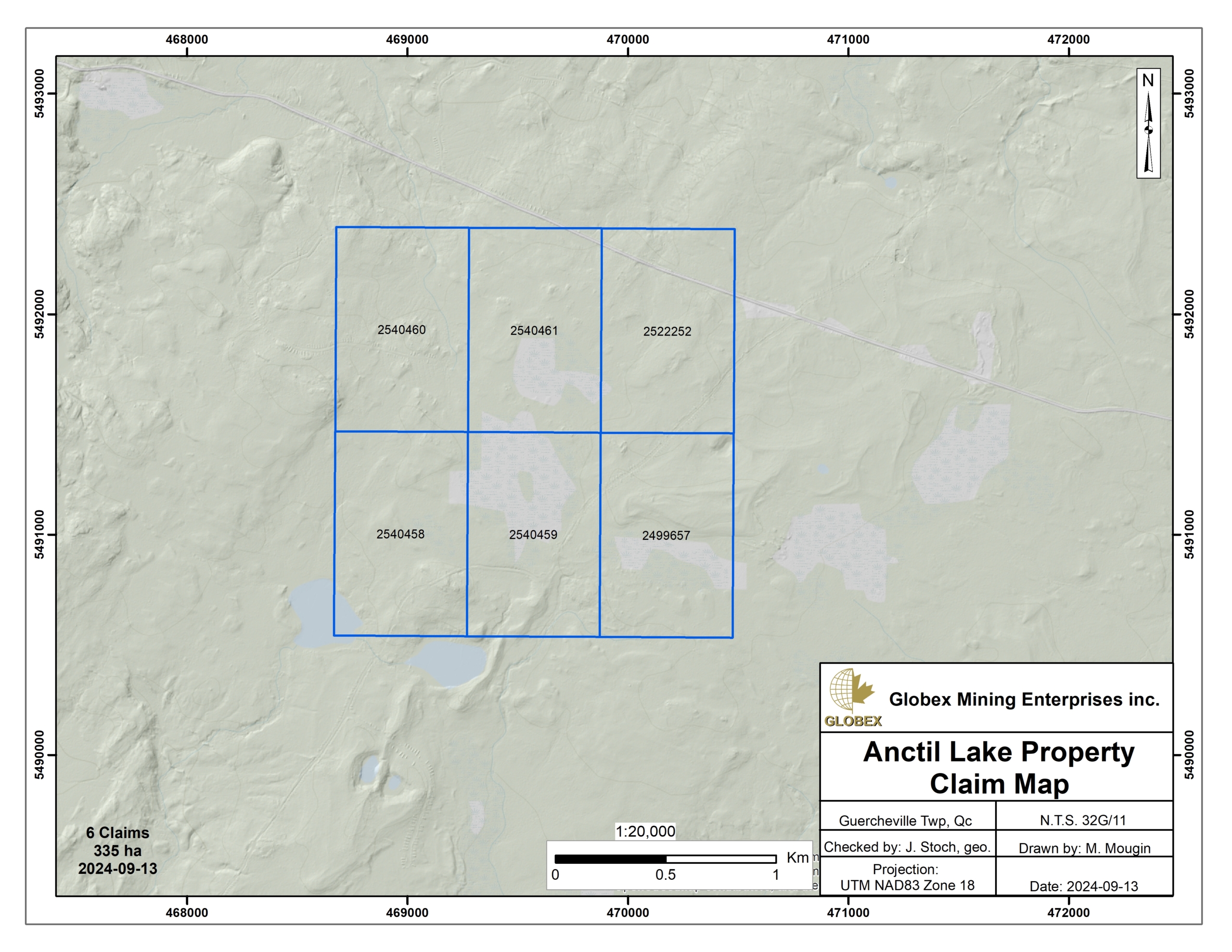 The Anctil Lake property is located in the Jamesie MRC of the Nord-Du-Quebec administrative region, about 40 km southeast of Waswanipi (Qc) and 85 km southwest of Chibougamau (Qc). It is composed of 6 contiguous mining titles totalling 335 ha west of Anctil lake, in the Guercheville township (NTS 32G11, Eeyou-Istchee James Bay Territory). These titles are fully owned by GSA mining entreprises inc. The property is accessible by road from Chapais (Qc), driving about 60 km to the south throughout a gravel roads network.