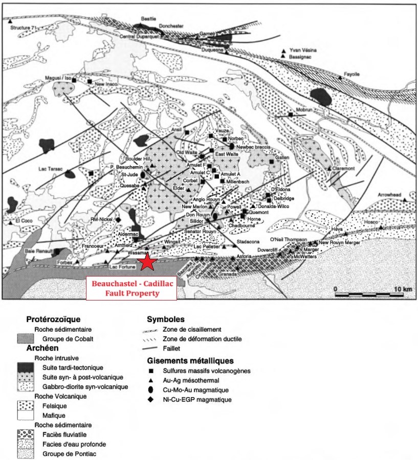 In the Beauchastel-Cadillac Fault property area, rocks of the Abitibi Sub-province belong to the Blake River Group (2703 – 2698 Ma; Nunes and Jensen, 1980; Mortensen, 1993) north of the CLL fault, while south of the CLL rocks belong to both the Pontiac Sub-province and the Gowganda Formation. The property covers approximately 6 km of the Larder Lake – Cadillac Break.