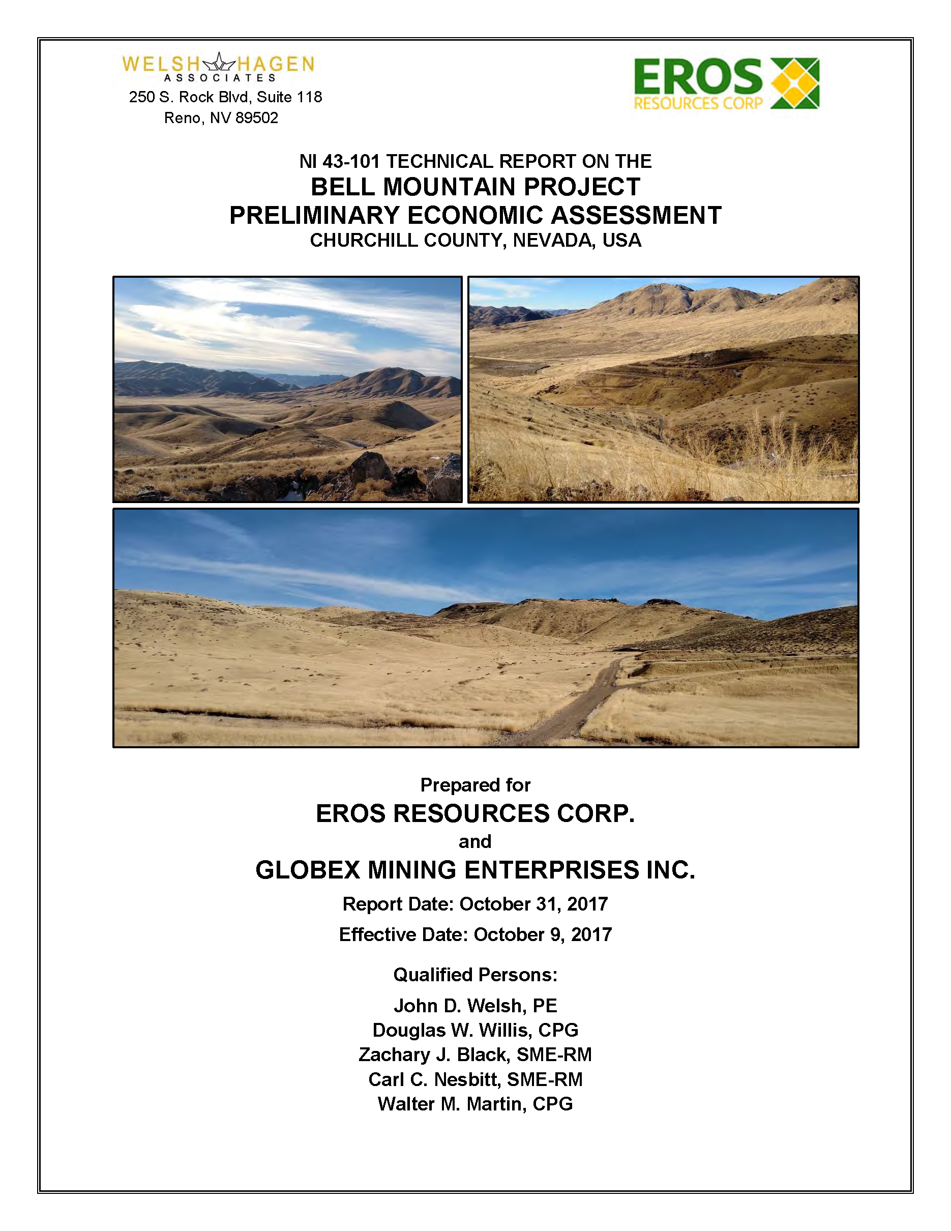 October 2017 NI 43-101 Technical Report On The Bell Mountain Project Preliminary Economic Assessment, Churchill County, Nevada, USA Prepared for Eros Resources Corp. and GSA Mining Enterprises Inc. by John D. Welsh, PE, Douglas W. Willis, CPG, Zachary J. Black, SME-RM, Carl C. Nesbitt, SME-RM, Walter M. Martin, CPG