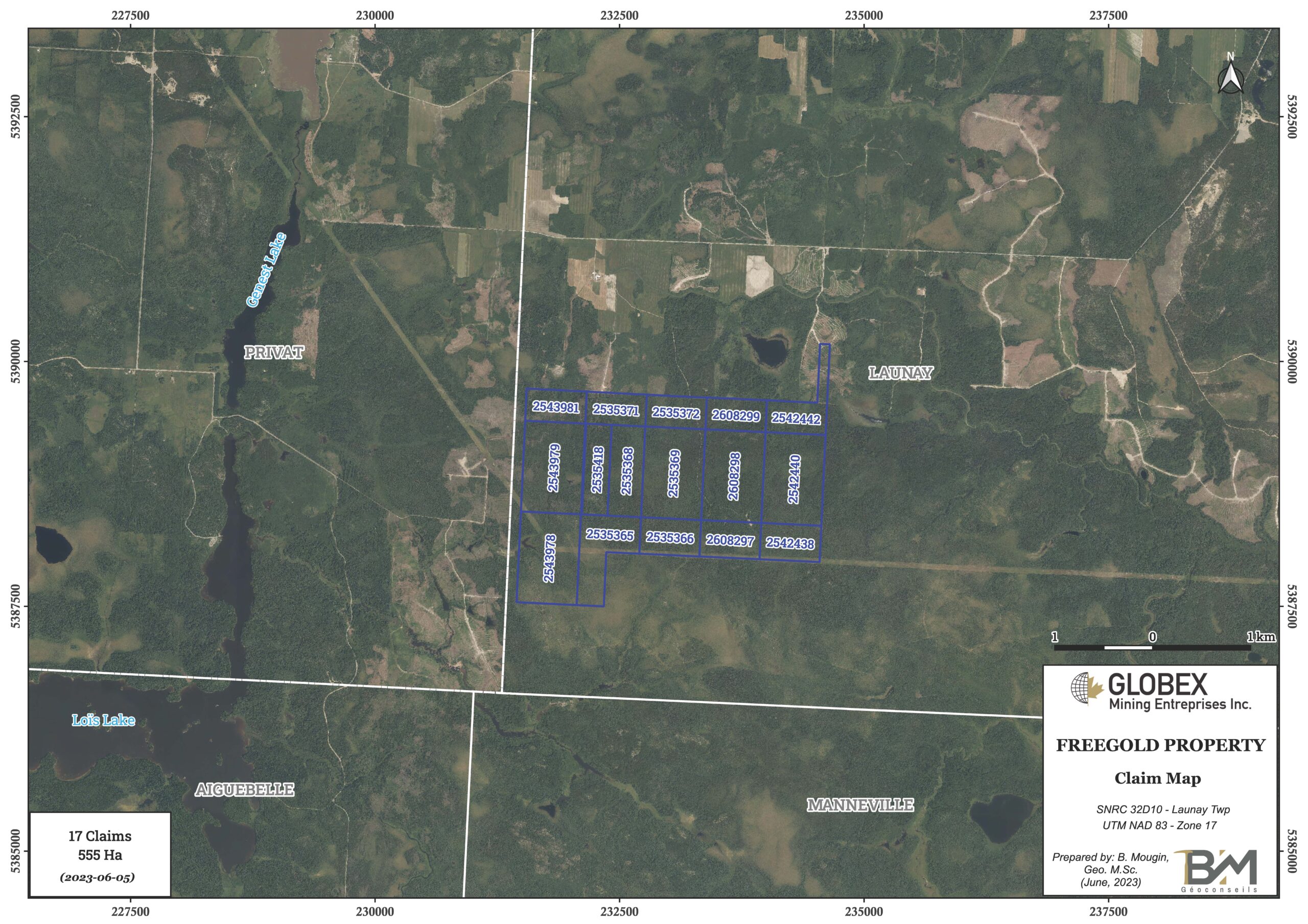 The Freegold property consists of 17 mining claims totalling 555 hectares in the Launay township (NTS 32D10), 30 km west of the town of Amos (Abitibi, Quebec). The claims are wholly owned by GSA and are not subject to any underlying royalties or third party interests.