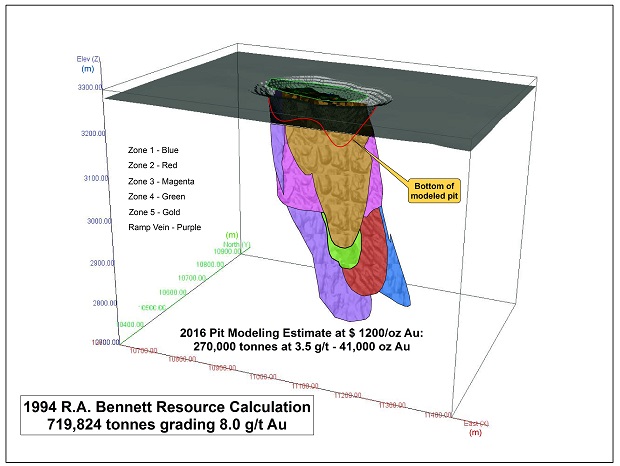 In January 1994, Robert A. Bennett was engaged to perform a property compilation and ore reserve. Mr. Bennett calculated a proven, probable, possible and drill indicated reserve (historical, non NI 43-101 compliant) to the 220 m level of 510,116 tons grading 0.248 oz/ton and a deep reserve of 283,358 tons grading 0.22 oz/t for a total Geological Ore Reserve in all categories of 793,474 tons grading 0.235 oz/t (191,284 contained ounces). He proposed a $2.1 million feasibility study, the bulk of which would be made up of 850 m of underground drifting, 250 m of underground raising, 5,000 m of diamond drilling and a 3,000 ton bulk test.