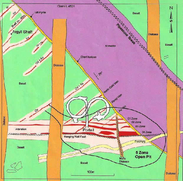 Between 1940 and 1946, Argyll Gold Mines dewatered the old shaft and did detailed sampling of the Shaft Vein. This was accompanied by 6,575 m of diamond drilling on the Beatty Township claims and resulted in the discovery of 7 gold bearing vein structures. Subsequently, Sylvanite drilled 1,487 m in 1947 and outlined several high grade gold veins of significant width.