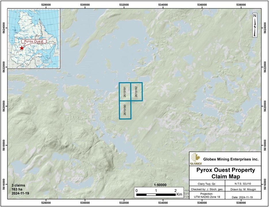 The Pyrox Ouest property is located about 85 km north of the town of Chibougamau, in the Nord-du-Quebec administrative region. The property is composed of 3 contiguous mining claims totalling 163.48 Ha in NTS 32J10 in the Clairy Township, Eeyou-Istchee James Bay Territory. These titles are fully owned by GSA and are not subject to any third party. The property is set on Category III lands where exploration is allowed under authorization of Native Communities.