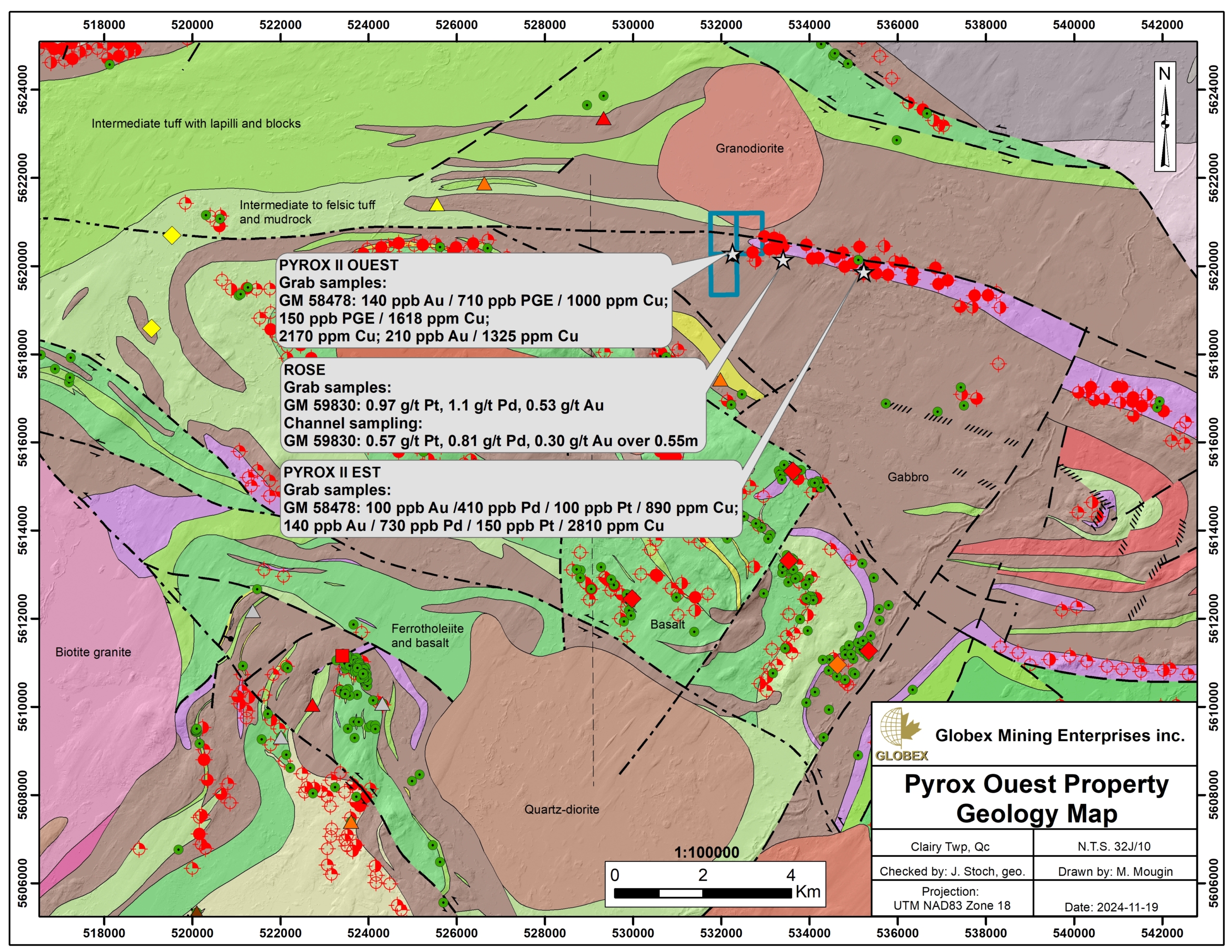 The Pyrox Ouest property is located in the Opatica Sub-province of the Superior Province of the Canadian Shield (Card and Ciesielski, 1986). Rocks of the Opatica deposited between 2.82 and 2.68 Ga (Davis et al., 1995) and consist of both volcano-sedimentary rocks and gneissic domains (Hocq, 1994). Metamorphism gradually increases from south to north from the greenschists grade to the granulites grade, with evidences of partial melting (Sawyer and Benn, 1992). New geological and geochronological data indicate that the Abitibi and Opatica sub-provinces form a single lithotectonic block where Opatica represents the basal part of the Abitibi crust (MB2014-04, MB2016-01).