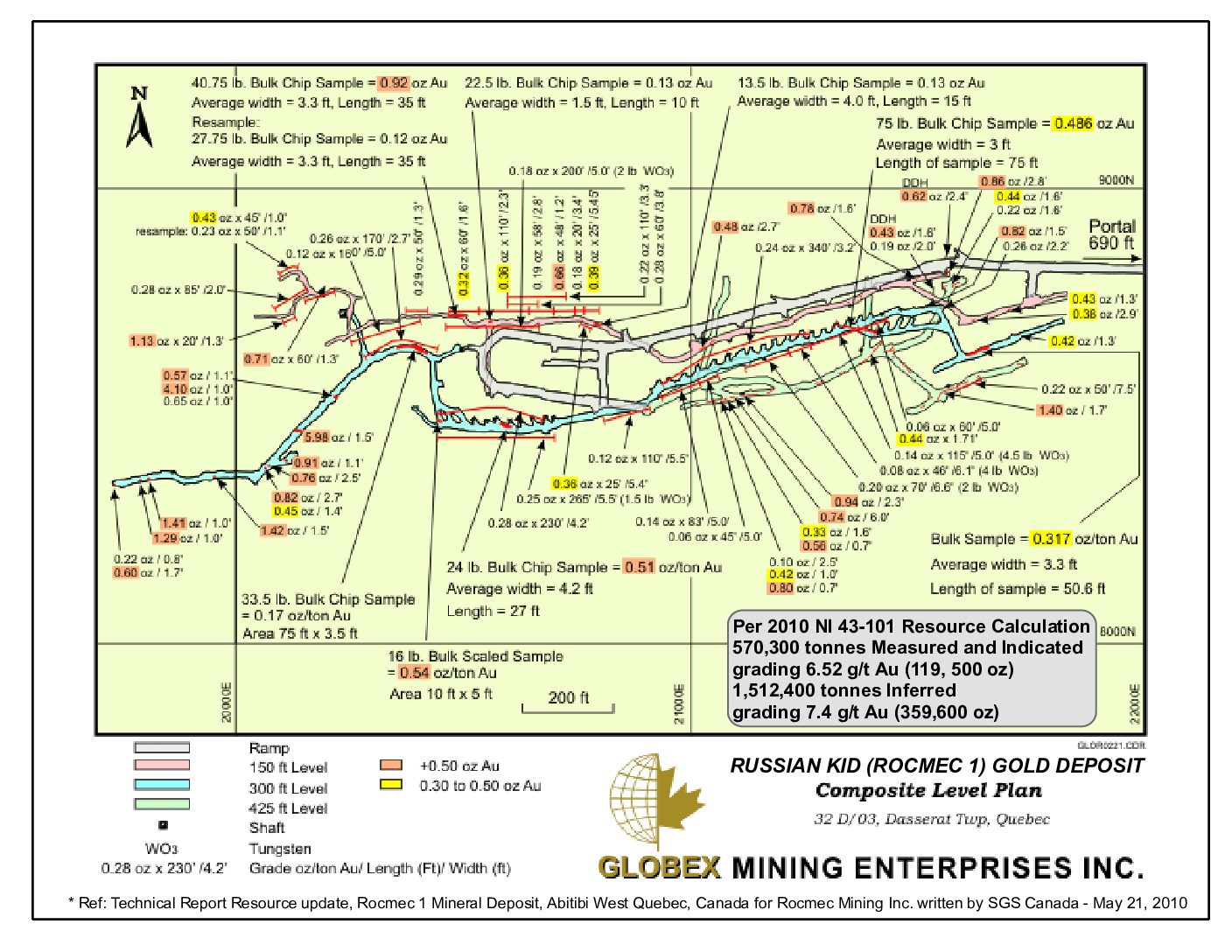 In March 1984, Asselin, Benoit, Boucher, Ducharme, Lapointe, Inc. (ABBDL – TECSULT) completed a feasibility study on the property. The study concluded that the property had a total resource of 1,124,532 tons grading 0.247 oz/ton Au; an additional 200,000 tons in the Talus vein were classed as a geological resource. This report was prepared prior to the implementation of National Instrument 43-101 and is considered a historic resource. It has not been reviewed by a Qualified Person for GSA and should not be relied upon.