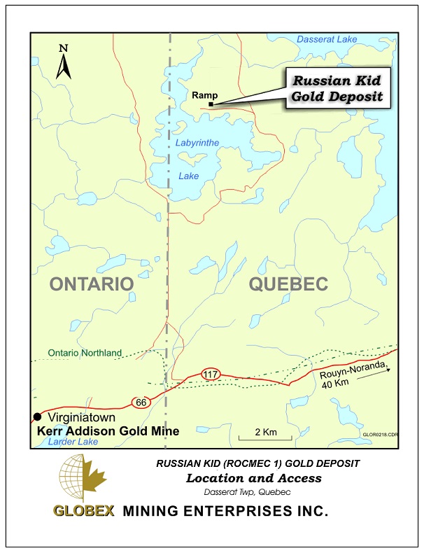 Access to the property is via an all season gravel road which leads northward from paved highway 117 near the Quebec-Ontario boundary. The gravel road follows the south and east sides of Lake Labyrinth directly to the mine site, a distance of approximately 16 km.