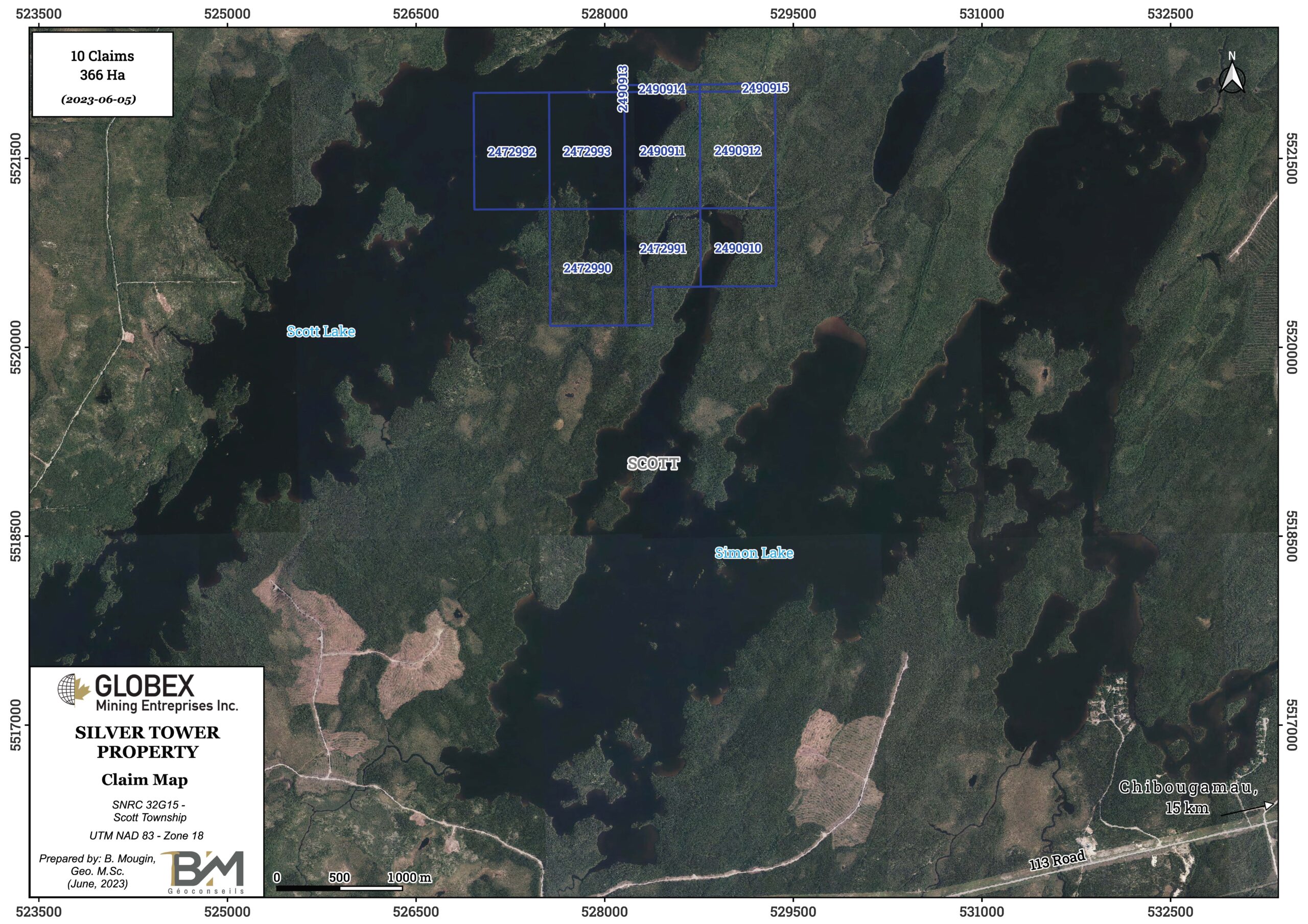 The Silver Tower property consists of 10 mining claims totalling 366 Ha in Scott township, approximately 20 km southwest from the town of Chibougamau (Eeyou-Istchee Baie-James, Qc). The claims are wholly owned by GSA and are not subject to any underlying royalties or third party interests.