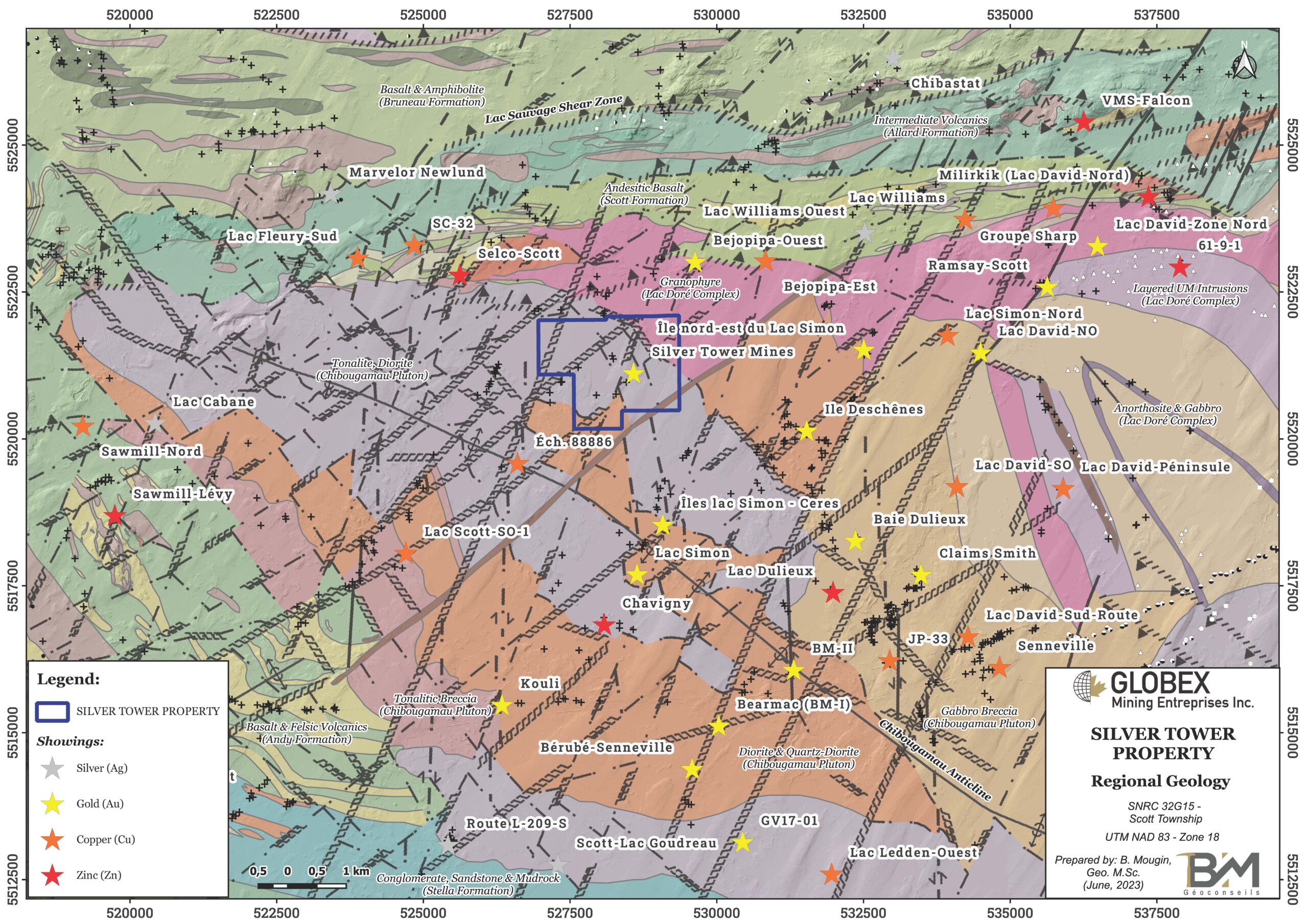 The Silver Tower property is located in the northern part of the Archean Abitibi Greenstone Belt, within the Superior Province of the Canadian Shield. Rocks of this area are composed of gabbroic to tonalitic intrusions of the polyphased Chibougamau Pluton and elder mafic to ultramafic (UM) intrusions of the layered Lac Doré Complex. These intrusions are surrounded by a belt of felsic to mafic volcanic rocks which have been verticalized after successive tectonic events during Archean and Paleoproterozoic and metamorphosed to the greenschists facies.