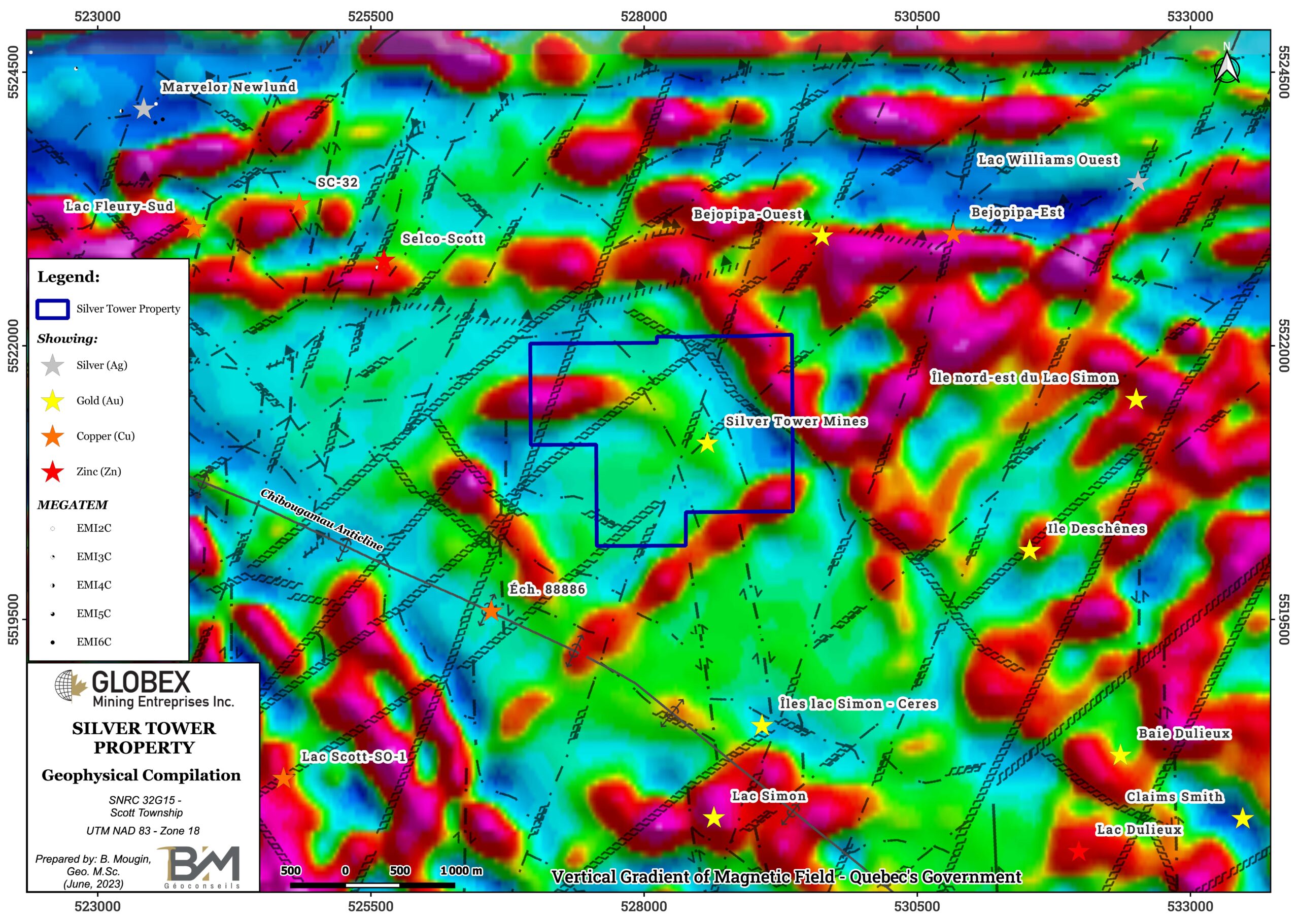 Discovery of the Silver Tower Mines showing in prospection dates from 1935 when a grab sample taken by McKay Exploration Syndicate returned 31,19 g/t Au, 1,46 % Cu, 5,62 % Zn et 0,72 % Pb (GM 10840-D). Numerous geophysical surveys including magnetism, electromagnetism (EM) and induced polarization (IP) have been undertaken during the following decades, as well as trenching and diamond drilling (GM 62244). DDH assays by SOQUEM in 2005 were deceiving and no more work was then planned on the property.