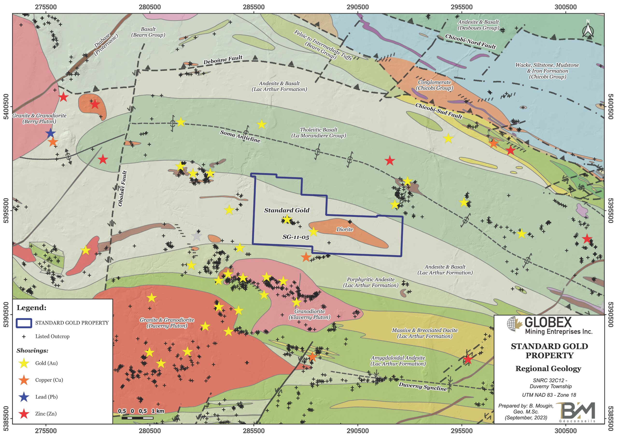 The Standard Gold property is located in the Archean Abitibi Greenstone Belt, within the Superior Province of the Canadian Shield. Rocks of this area are composed of intermediate to mafic calc-alkaline volcanics of Lac Arthur Formation and tholeiitic basalts of La Morandière Group. Chicobi sedimentary basin lies north of the property bounded by the Chicobi-Nord and Chicobi-Sud faults. Berry Pluton is located west of the property and Duverny Pluton is to the south. Several diorite and gabbro intrusions of probable synvolcanic origin are observed throughout that area (MB95-24).