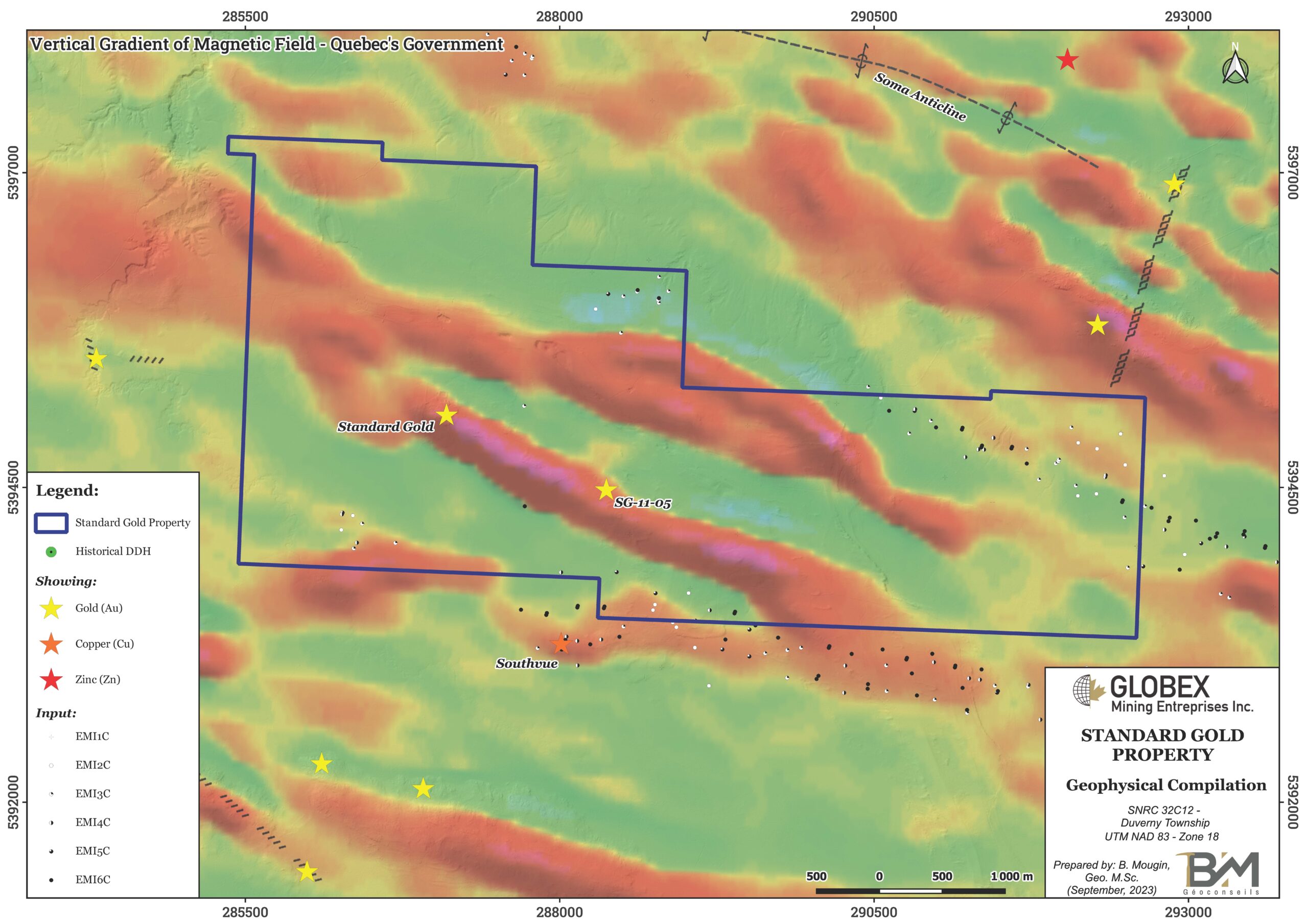 Rest of the property remains poorly explored in comparison with the deposit area. Numerous EM and IP axes were highlighted by limited historical geophysical works and not all of them were tested appropriately. Particularly, no DDH has ever been implanted along the southeastern extension of the highly magnetic horizon in which both Standard Gold deposit and SG-11-05 showing occur.