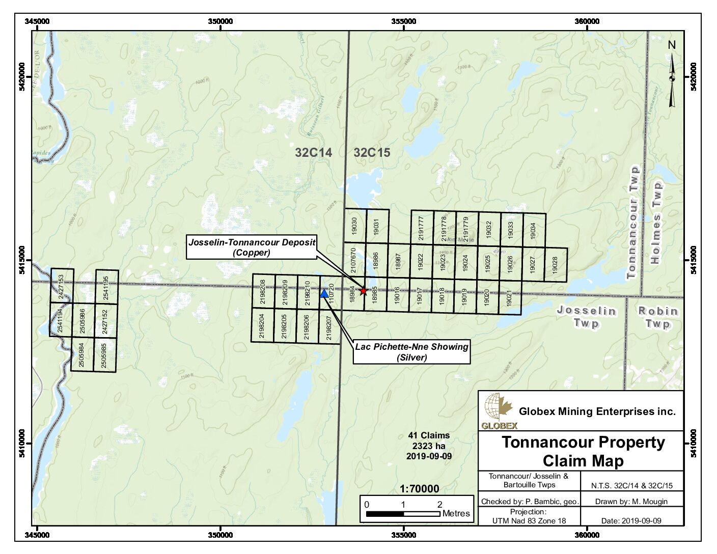 Tonnancour is comprised of 41 claims totalling 2,323 hectares which are composed principally of one main block which originates immediately east of the north flowing main tributary Bell River and a smaller peripheral claim block to the northwest which occupy the southwest quadrant of Tonnancour Township and the northeast portion of Josselin Township, Quebec, approximately 20 km south by active logging roads from the forest industry town of Lebel-sur-Quevillon. This property is wholly owned by GSA and is not subject to any underlying royalties or third party agreements. There has not been any mineral production in the area but a small, sub-cropping VMS deposit found in the early 1970’s by Noranda Exploration with a reported non NI 43-101 compliant historic resource of 55,000 t grading 2% Cu, 3% Zn and 26 gpt Ag based on 4,100 metres of drilling (Josselin Prospect), is located in the south central portion of the main claim block.