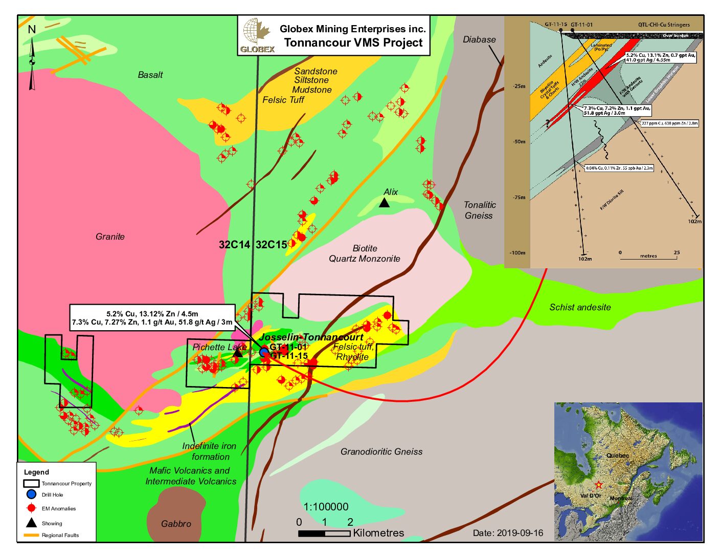 Significant base and precious metal mineralization was however confined to the Josselin VMS deposit where better intercepts returned exceptional values of 4.55 m of 5.23% Cu, 13.12% Zn, 41.0 gpt Ag and 0.718 gpt Au (Hole GT-11-01) as well as 3.0 m of 7.3% Cu, 7.27% Zn, 51.8 gpt Ag and 1.1 gpt Au (Hole GT-11-15): see Figure 8. Based on these significant drilling results within the known VMS zone and the identification of new areas of semi-massive/stringer mineralization elsewhere within the Tonnancour Greenstone Belt, additional staking of 77 claims totalling 4,359 hectares was undertaken in 2011 immediately SW and NE of the original Tonnancour property to cover published aeromagnetic and electromagnetic anomalies situated along the inferred extensions of the Belt.