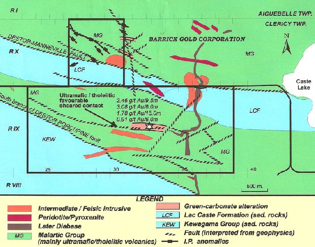 The property is located on a southern splay of the gold localizing Porcupine-Destor Fault. Wide zones of intense alteration and low grade gold mineralization have been found at the centre of the largely overburden covered property. Further exploration is warranted.